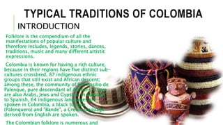 Colombia has a rich culture due to its diverse ethnic groups and indigenous populations. Some typical Colombian traditions include colorful local festivals and carnivals, distinctive crafts made by indigenous groups, and varied regional cuisines that reflect the country's agricultural diversity. Religion also plays an influential role in Colombian customs, with many Catholic religious celebrations throughout the year.