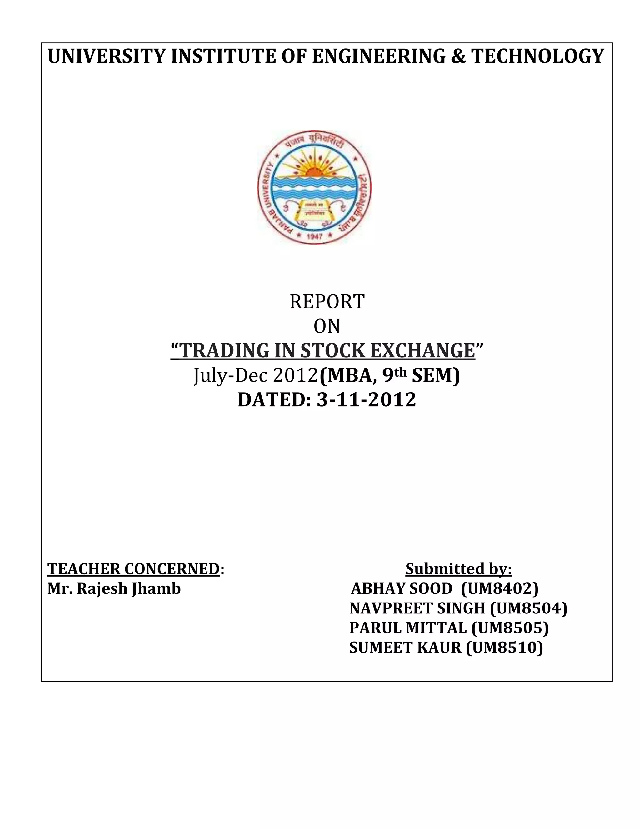 The document provides an overview of investments and financial markets in India. It discusses key concepts like the stock exchange, SEBI, BSE, NSEI, MCX, NCDEX and their roles. It also describes various stock market indices like BSE SENSEX, NIFTY 50. The document is a report submitted by students for their MBA coursework covering basics of investments, trading, technical analysis and factors affecting the stock market.