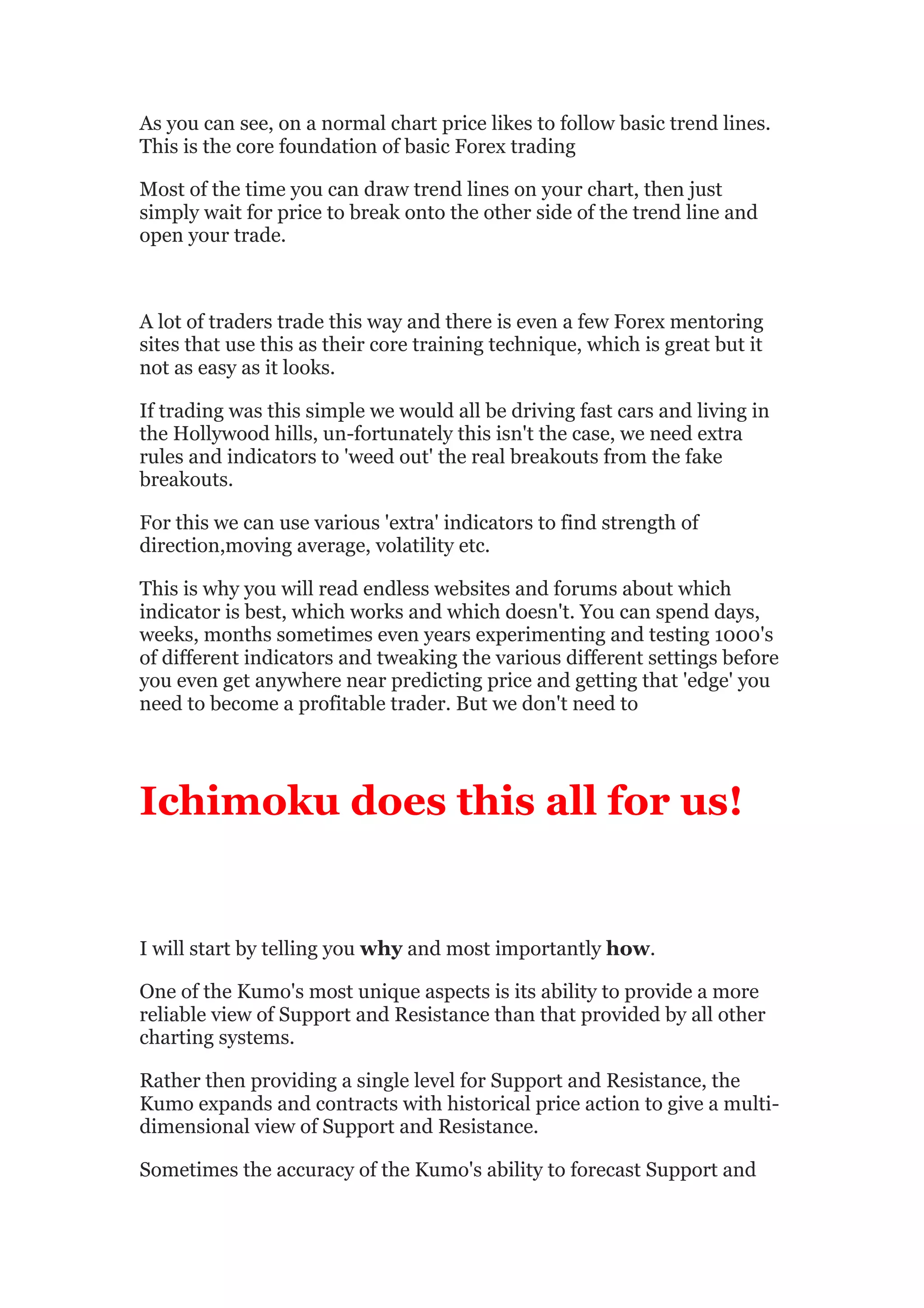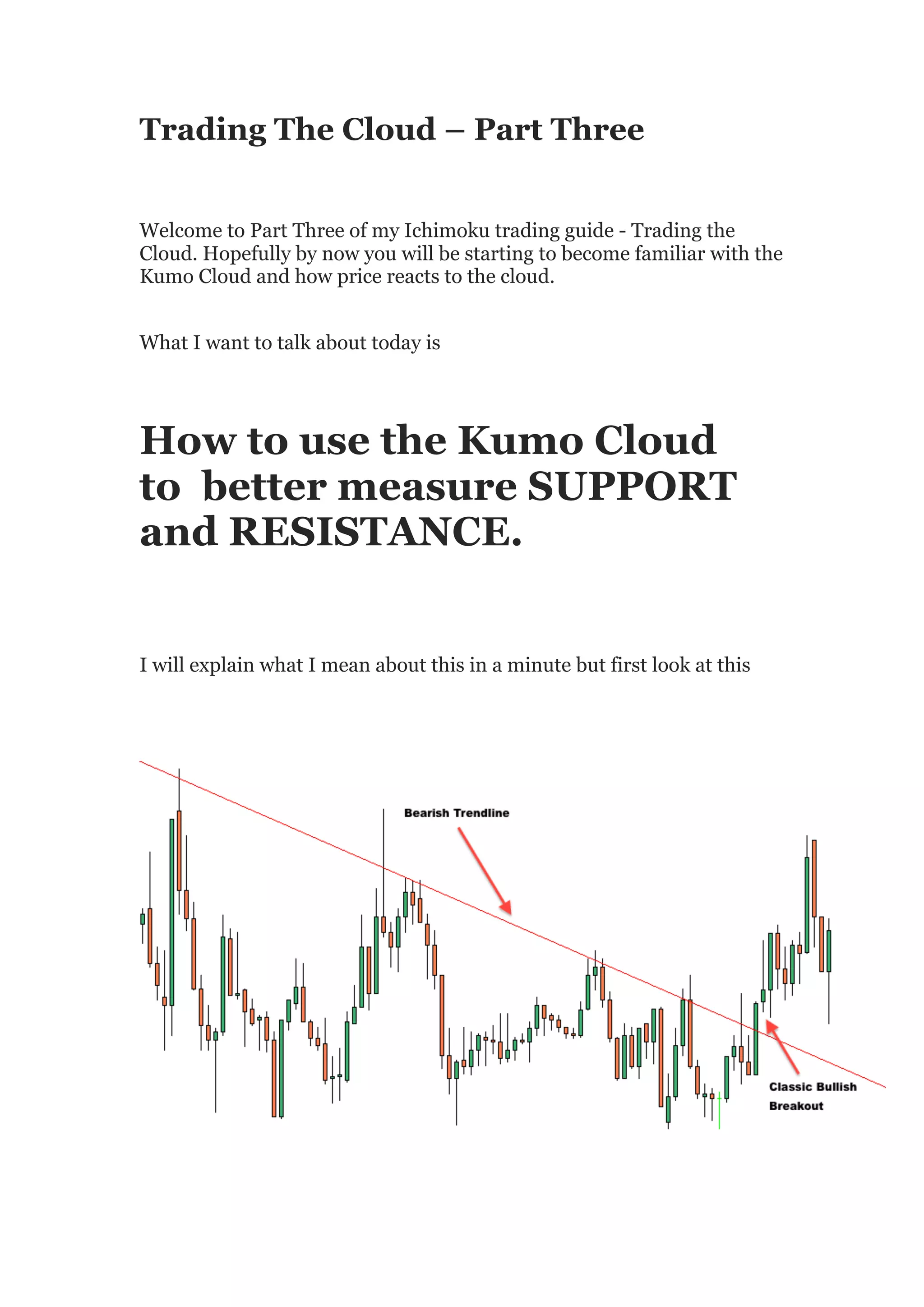This document discusses the use of the kumo cloud in forex trading, emphasizing its role in measuring support and resistance effectively compared to traditional trend lines. It explains how the thickness of the kumo can indicate market volatility, aiding traders in making informed decisions about trade entries and stop-loss placements. The author encourages readers to understand these concepts to enhance their trading strategies and invites them to follow future lessons on the subject.