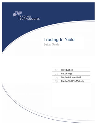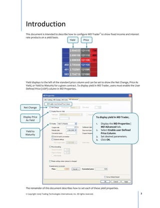 This document describes how to configure the MD Trader application to display fixed income products as yields. There are three yield types that can be displayed: Net Change, Price as Yield, and Yield to Maturity. To enable yields, users must turn on the User Defined Price column in the MD Properties settings. The document then provides details on how to set the parameters for each yield type.