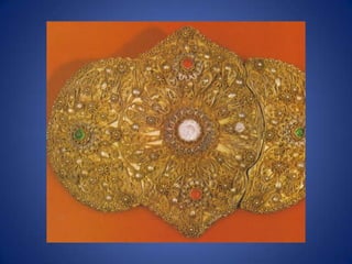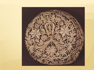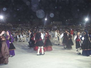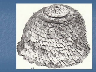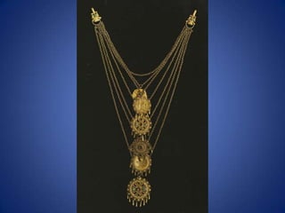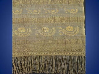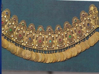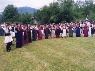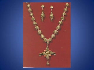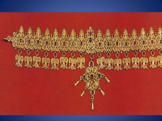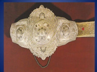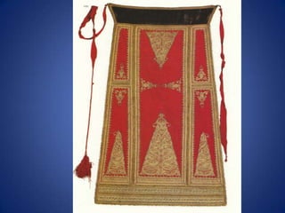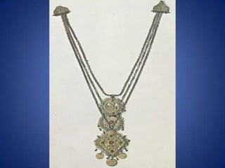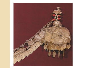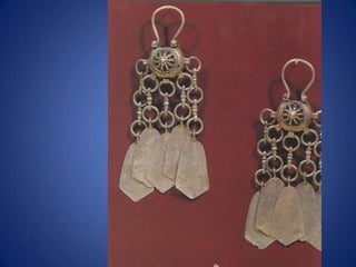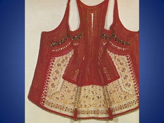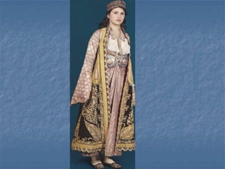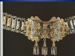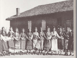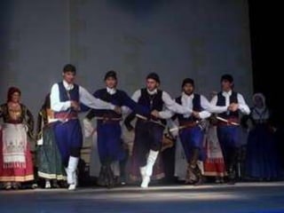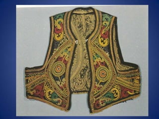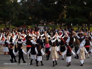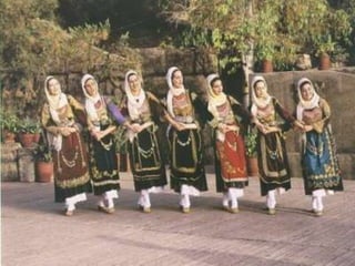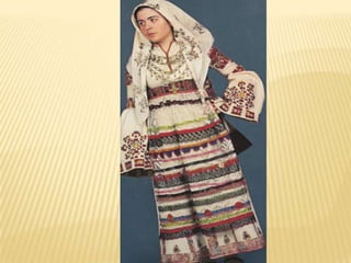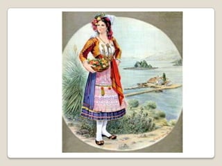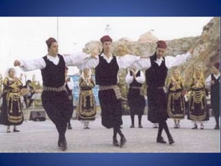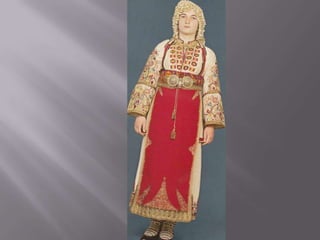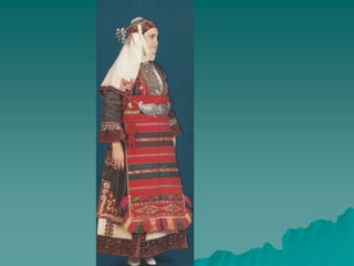 Traditional Greek costumes and accessories varied by region but commonly included long skirts or dresses for women along with decorative accessories like headscarves. Men typically wore knee-length pants and shirts along with hats. Regional variations included different fabrics, colors and styles of clothing and accessories.