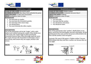 This document describes the rules for two traditional games - Broomstick Game and Hidden Sardine. The Broomstick Game involves couples dancing and passing a broomstick between them to music, with the last couple holding the broomstick when the music stops being eliminated. Hidden Sardine involves one player hiding while others seek and hide with them, with the last person to find and join the hiding group losing and becoming the next hider. Both games can be played by an unlimited number of players indoors or outdoors.