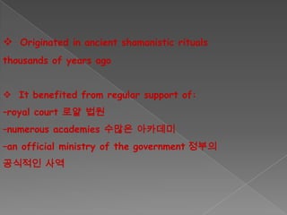 Korean traditional dance originated from ancient shamanistic rituals thousands of years ago and was supported by royal courts, academies and the government. There are six main types of traditional Korean dance today - Court, Folk, Shamanistic, Confucian, Buddhist and Modern. Many dances feature unique gestures like sliding the feet and lifting the shoulders. Popular folk dances include the Fan Dance performed with colorful fans, the Salpuri dance to exorcise spirits, and circle dances like Kanggangsuwollae. Masked dances incorporate music, mime and drama. The Sword Dance and Drum Dance showcase those instruments. Traditional dances are now preserved through academies as important parts of Korean cultural heritage.