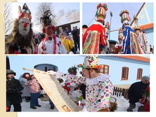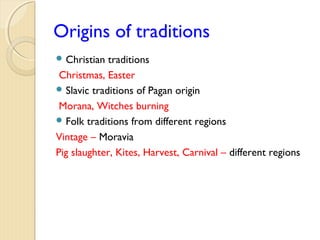 Traditions in the Czech Republic have origins in Christian, Slavic Pagan, and regional folk traditions. Some spring traditions include celebrating Morana, the Slavic goddess of death and winter, by burning an effigy of her. Easter is celebrated by painting eggs, whipping as a fertility ritual, and burning witches on Walpurgis Night. Summer traditions include regional fairs and harvest celebrations. Autumn traditions include vintage celebrations of wine, remembering deceased loved ones, and kite flying. Winter traditions include Advent wreath lighting, St. Barbara and St. Nicholas bringing gifts, Christmas Eve carp dinner, pig slaughter, and carnival celebrations like the famous Hlinsko carnival parade.