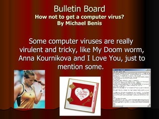 This document provides tips on how to avoid getting computer viruses and advice for getting good customer support for PCs. It recommends not opening attachments from unknown senders, enabling macro security in Microsoft Word, and using antivirus software. It also advises backing up work, having a backup computer, and using firewalls. The document reviews several PC retailers and provides tips to avoid problems with PC components like dust.