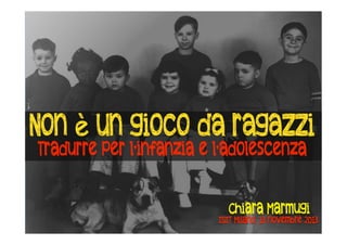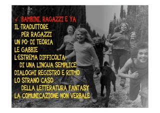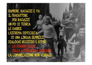 Il documento discute le difficoltà di tradurre libri per bambini e ragazzi, sottolineando la varietà di generi, stili e linguaggi necessari per un pubblico eterogeneo. Si evidenzia l'importanza di mantenere un equilibrio tra l'esperienza del lettore giovane e le aspettative dell'autore adulto. Vengono forniti suggerimenti pratici su come affrontare la traduzione, come evitare gerghi e mantenere una lingua vivace e appropriata.