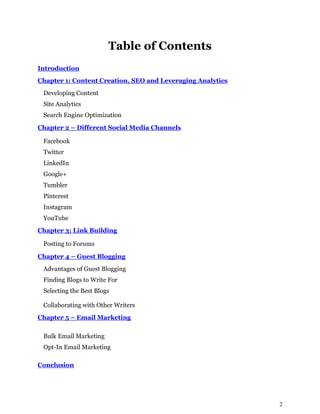 This document provides an overview of different techniques for driving traffic to a website, including content creation, search engine optimization, social media, link building, guest blogging, and email marketing. It discusses developing high-quality content in various formats and leveraging analytics to understand user behavior. It emphasizes search engine optimization techniques like keyword research and on-page optimization. It also explores major social media platforms like Facebook, Twitter, and LinkedIn and how businesses can effectively utilize each one.