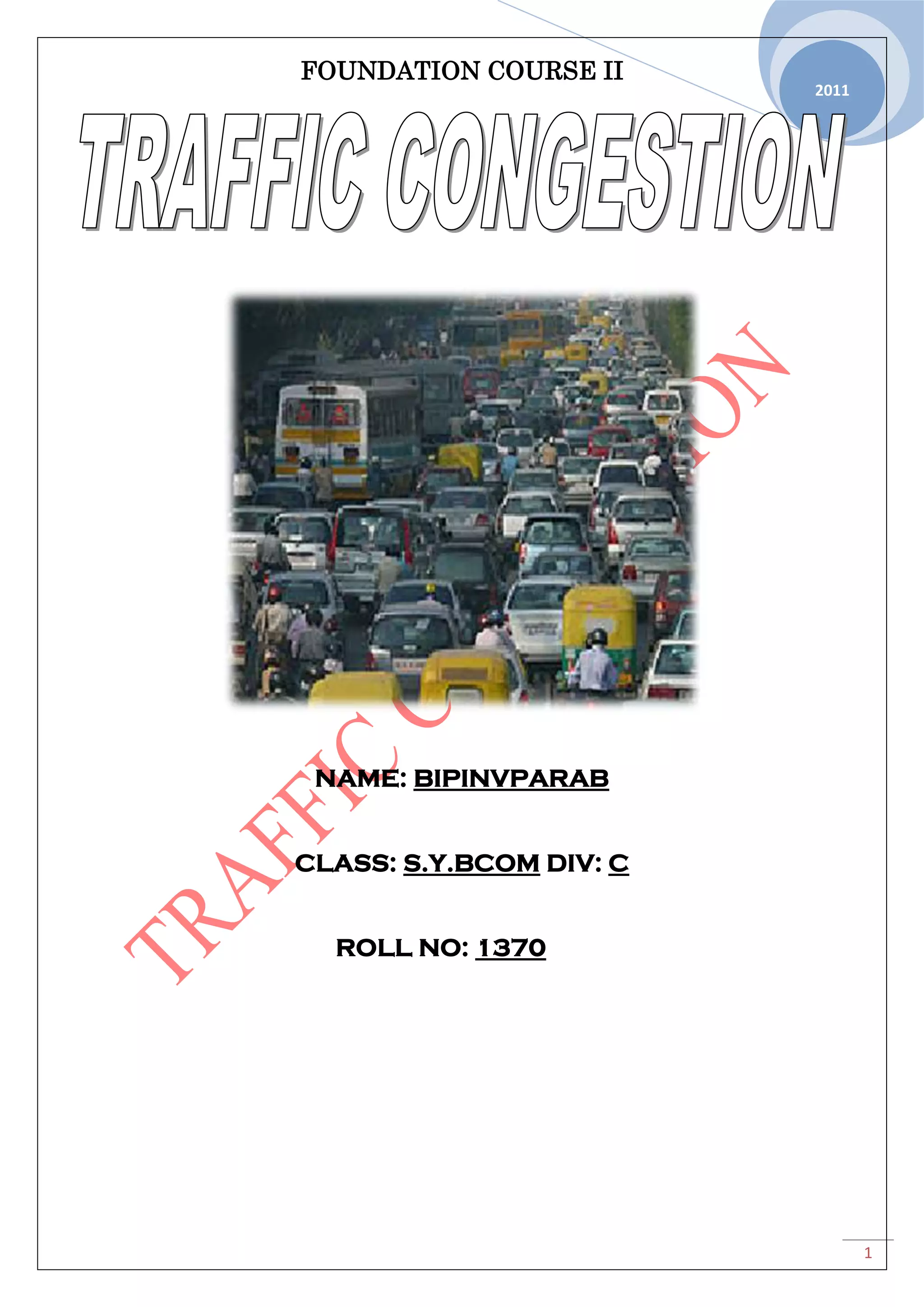 This document discusses traffic congestion and its causes and effects. It provides background on traffic congestion, explaining that it occurs when traffic demand exceeds road capacity. Some key causes mentioned include the high number of vehicles on roads, lack of public transportation infrastructure, and road design issues. The effects discussed include increased pollution, economic impacts of delays, road rage, and impediments to emergency vehicles. Solutions proposed involve improving road infrastructure, implementing better traffic control measures, and encouraging public transit use.