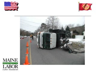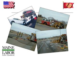 This document provides an overview of traffic safety training for firefighters. It discusses Maine laws regarding public safety traffic flaggers, the Manual on Uniform Traffic Control Devices, liability exposures, and terminology related to traffic control zones. It also provides benchmarks and best practices for apparatus positioning, incident command responsibilities, crew safety, and use of traffic control devices. The training emphasizes establishing a protected work zone, proper use of signs, cones and other devices, and wearing high-visibility safety clothing when working near traffic.
