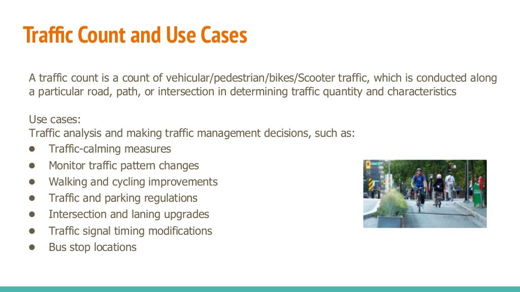 The document discusses traffic counts, detailing the methods and use cases for analyzing vehicular and pedestrian traffic to inform traffic management decisions. It includes descriptions of various data collection methods such as permanent counters and turning movement counts, alongside criteria for identifying errors in data. Additionally, it outlines processes for data processing and reporting, including calculating average daily traffic metrics.