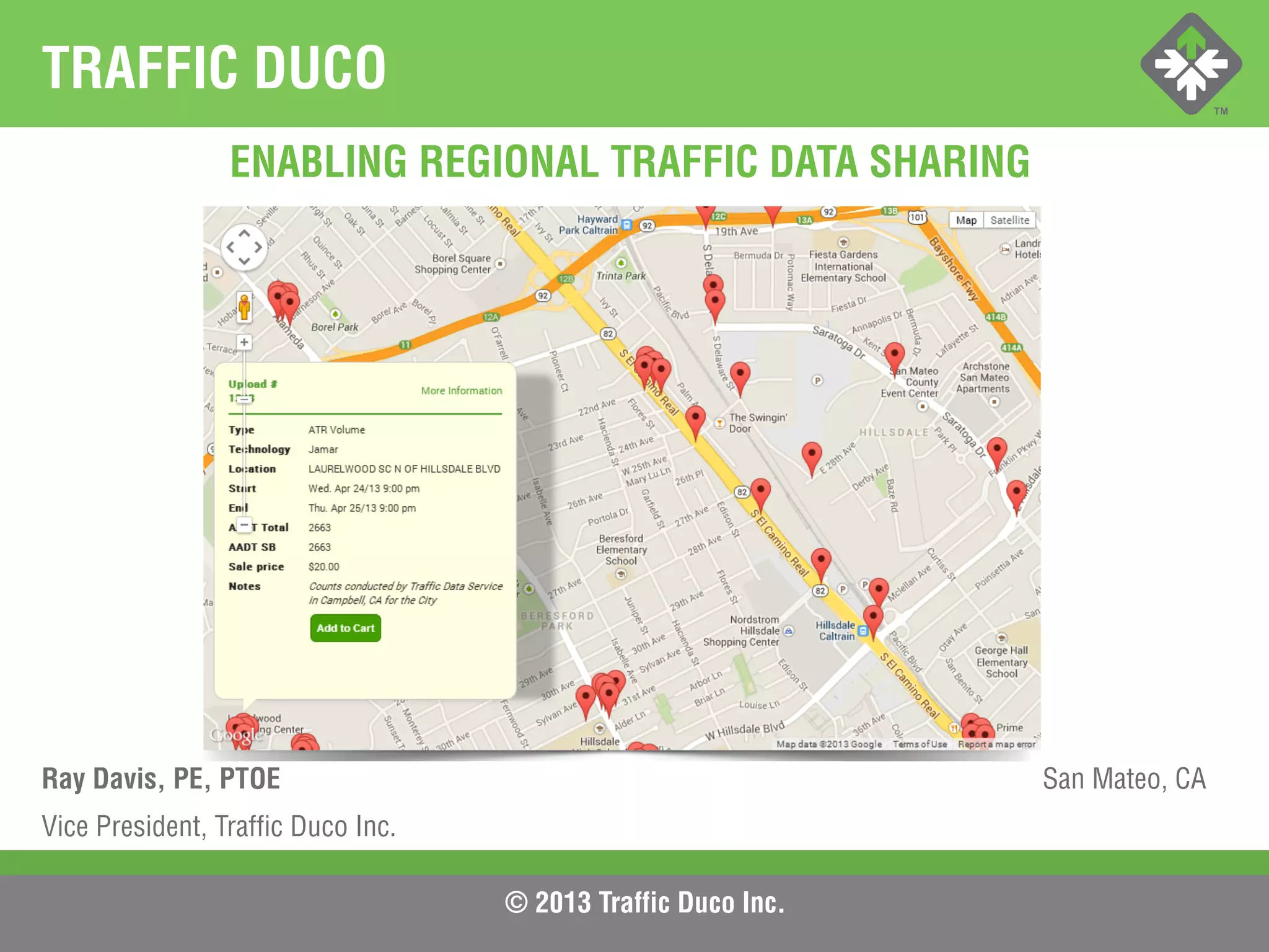 The document discusses Traffic Duco's solution for enabling regional traffic data sharing through a web-based platform. It highlights advantages like saving time finding data, reducing redundant surveys, and collecting more data with the same resources. Factors inhibiting data sharing include high upfront software costs and disconnected systems. Traffic Duco's solution provides an integrated web service and mobile apps for traffic data collection, management, and sharing through a cost-effective transactional model. It allows users to search, import, map, and securely share or sell traffic data.