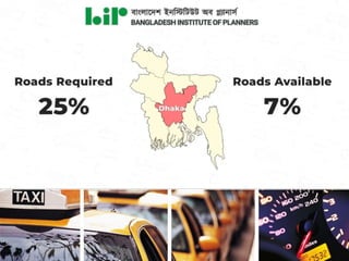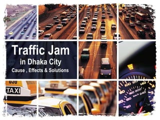 Traffic jams in Dhaka City cause significant problems and economic losses. Some of the main causes of traffic jams include poor traffic administration, insufficient roads, wrong parking, and a lack of public transportation options. This leads to effects like people wasting hours stuck in traffic each day, physical and mental stress, and billions of dollars lost from the national economy annually. Potential solutions include expanding public transit, improving road infrastructure, enforcing traffic rules, and restricting private vehicle growth.