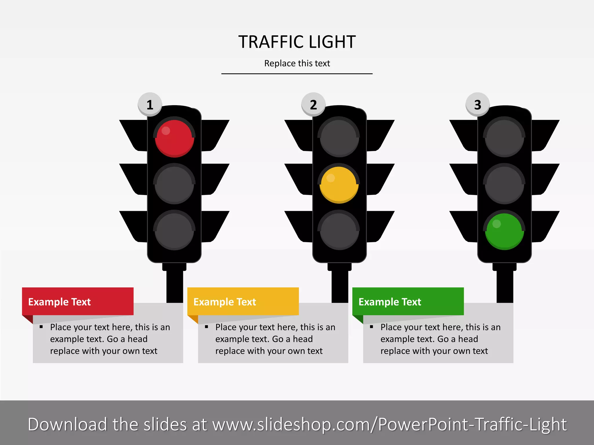 The document appears to be a template for a PowerPoint presentation on traffic lights. It contains placeholder text and formatting across 11 slides instructing the user to replace the example text and placeholders with their own content. A website is provided for downloading the slide template.
