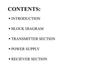 This document describes a wireless traffic light priority control system for emergency vehicles. The system has a transmitter section in emergency vehicles that sends signals to a receiver section connected to traffic lights. The transmitter section consists of switches to select light directions, an encoder to convert switch signals to radio waves, and an RF transmitter. The receiver section has an RF receiver to get signals, a decoder to convert them to microcontroller input, an AT89S52 microcontroller to control lights, and LED indicators representing traffic lights. The system is intended to prioritize green lights for emergency vehicles to reduce traffic delays.