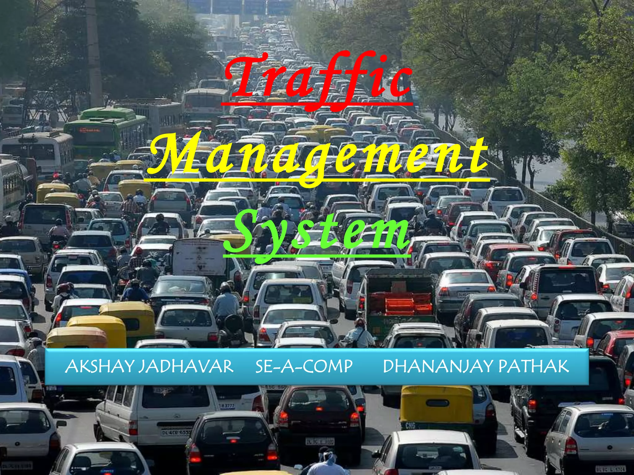 This document discusses traffic management systems. It begins by defining traffic and listing what can constitute traffic, such as vehicles, pedestrians, and animals. It then lists some common reasons for traffic like increasing vehicle numbers, accidents, and rule violations. The document outlines some basic traffic rules and regulations using road signs as examples. It also discusses some Indian vehicle acts and common traffic offenses. Statistics on traffic enforcement in India from 2002-2013 are presented. Potential solutions to traffic problems involve improving infrastructure, following traffic rules, and strict enforcement of laws. The local Pune context involving BRTS and road safety initiatives is also mentioned.