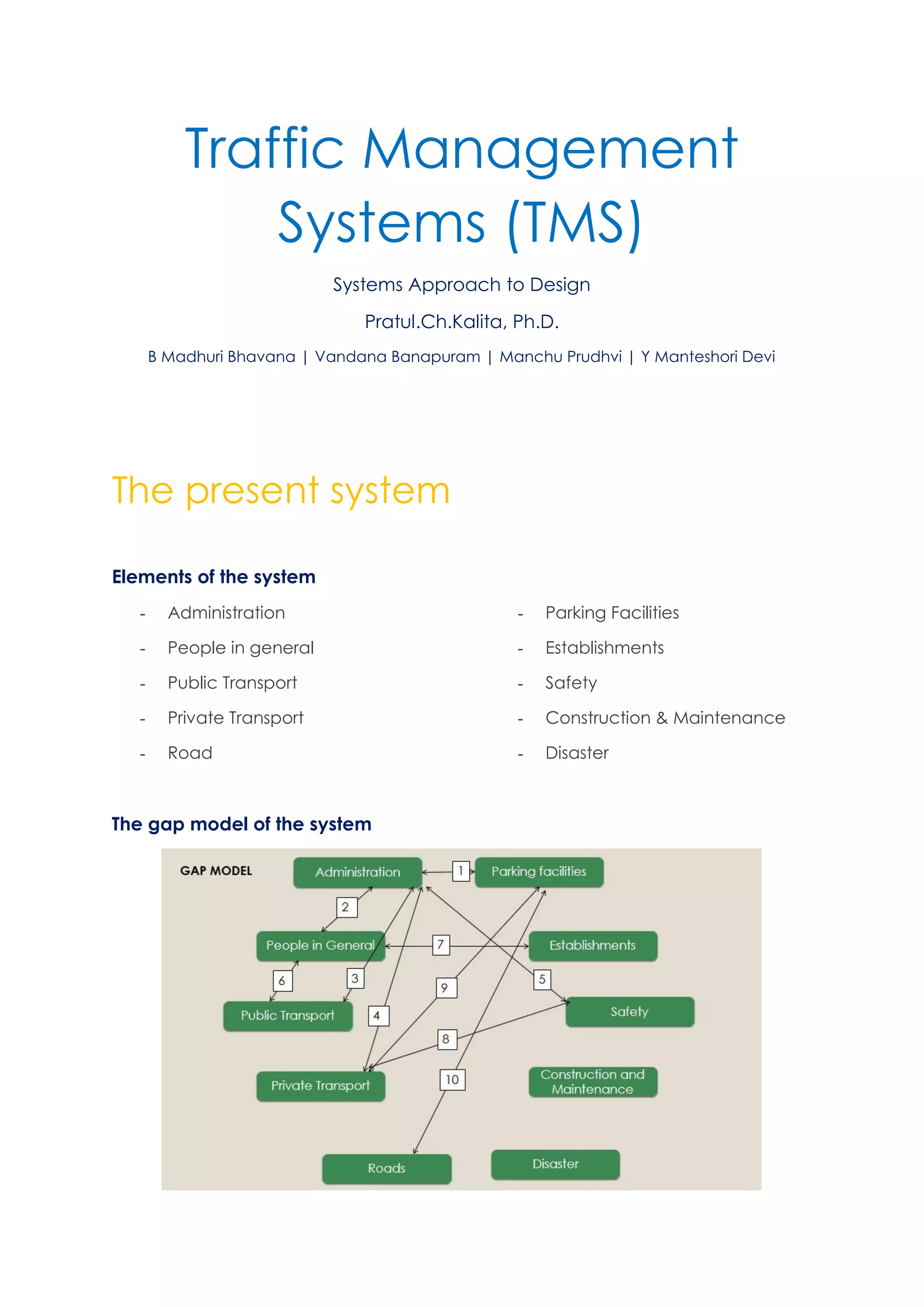The document discusses a proposed mobile application called Traffic Guru to help manage traffic in cities. It would allow users to view current traffic conditions and get alternate routes, see bus schedules and contact taxis. Key features include real-time traffic updates, route saving abilities, and alerts about road closures. The application aims to bridge gaps between public transportation and administration using a simple, easy-to-use design. It could serve as a useful tool for developing cities that experience unplanned growth and lack existing traffic management systems. Further developing gesture or voice inputs and accessibility for disabled users were discussed as areas for potential improvement.