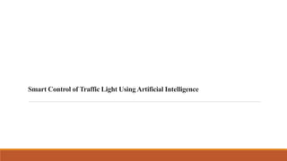The document proposes a smart traffic light control system using artificial intelligence. It uses a simulation in pygame to demonstrate traffic junctions and detect vehicles in real-time using YOLO object detection. Vehicle density is calculated and used by a signal switching algorithm to optimize green light times and reduce traffic congestion. The system classifies vehicles and adapts signal timing based on current traffic conditions like density. This allows traffic to clear faster than a static system, lowering delays, congestion, fuel use, and pollution.
