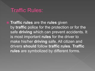 The document outlines essential traffic rules and regulations aimed at promoting safe driving and preventing accidents. Key points include adhering to speed limits, using traffic lights appropriately, maintaining safe distances, and the importance of wearing helmets and seat belts. It emphasizes the need for strict driving tests and safety awareness starting from childhood to mitigate risks such as drunk driving and speeding.
