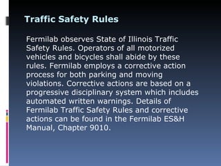 Fermilab observes Illinois traffic safety rules and has identified five factors contributing to most on-site vehicle accidents: improper backing, hazardous weather, distracted driving, speeding, and improper road sharing. Fermilab employs corrective actions for violations which are detailed in its ES&H Manual. The document provides tips for safe driving practices including proper backing techniques, winter driving preparedness, avoiding distractions, maintaining safe speeds, and sharing the road courteously with bicycles and motorcycles.