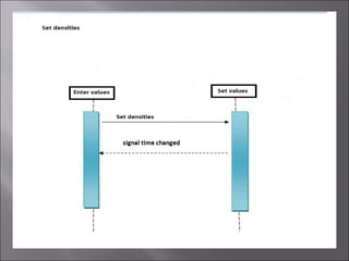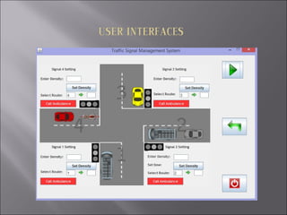 The document describes a traffic signal management system that provides traffic flow control and real-time traffic signal timing analysis. It can integrate with hardware to remotely control traffic signals and override signals for emergency vehicles. The system manages four-way intersections and allows traffic authorities to control signal timing based on traffic conditions.