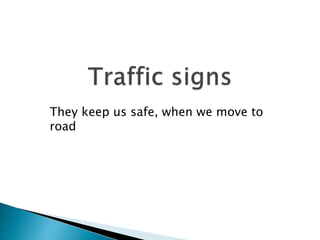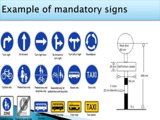 Road signs provide regulations, warnings, and guidance to help drivers use roadways safely and efficiently. Regulatory signs, which are red and white, dictate traffic laws using shapes like octagons and triangles. Warning signs, which use yellow, orange and red, give advance notice of hazards. Informative signs provide general guidance and are green, blue or white in color and rectangular in shape. The purpose of these various signs is to regulate traffic and protect drivers.