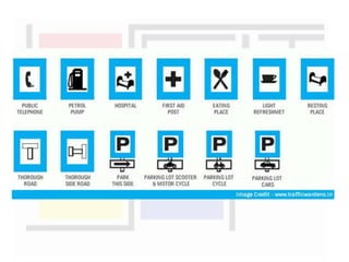 The presentation discusses the importance of traffic signs in conveying information, instructions, and warnings to drivers, highlighting their role in promoting road safety and reducing traffic accidents. It categorizes traffic signs into mandatory, cautionary, and informatory signs, each serving specific purposes to facilitate safe road usage. The document emphasizes the necessity of awareness campaigns to mitigate road fatalities in India, which has one of the highest rates of road accidents globally.