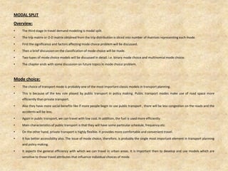The document discusses modal split and trip distribution models in transportation planning. It describes the factors that influence mode choice such as trip characteristics, transportation facilities, and traveler attributes. Two main types of modal split models are discussed: trip-end models which are sensitive to short-term changes, and trip-interchange models which can incorporate long-term policy decisions. Trip distribution is the second stage of travel demand modeling and involves distributing trips from origins to destinations using methods like the growth factor model and gravity model.
