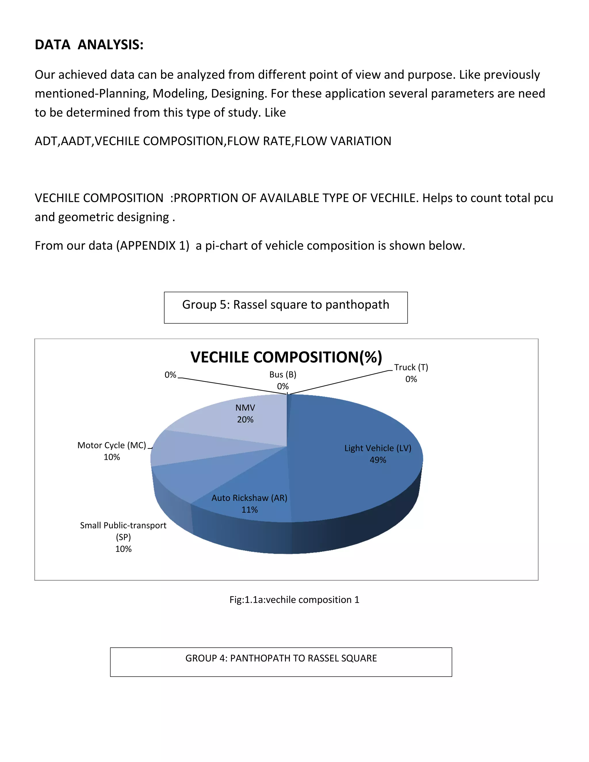 1. Vehicle composition - Light vehicles make up 49% of traffic, while motorcycles and auto rickshaws each make up 10%.