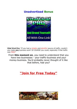 This document provides tips and strategies for using traffic exchanges to generate free traffic for an internet business. It discusses what traffic exchanges are, their benefits, how they work, features to consider when choosing one, how to develop a downline, 10 tips for using them effectively, and strategies like direct sales letters, squeeze pages, and splash pages. The overall message is that traffic exchanges can provide targeted, low-cost traffic if used properly as part of an overall online marketing plan.