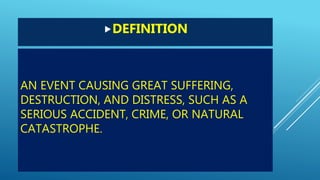 This document discusses the Islamic perspective on dealing with tragedies and calamities. It begins by defining tragedies as events causing great suffering. It then cites Quranic verses indicating that trials are promised for believers to test their faith. The document outlines several reasons for calamities according to Islam, such as being a test of patience or means of expiation of sins. It provides hadiths emphasizing the rewards of patience during hardships and trusting in Allah's mercy. Overall, the document advises accepting calamities with patience, as this raises one's status with Allah, and not to despair as great rewards come from great trials.