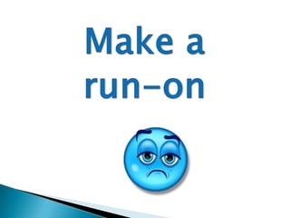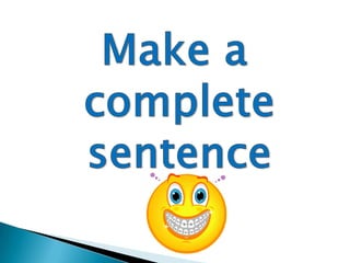 The document defines and provides examples of four types of sentences: complete sentences, fragments, compound sentences, and run-on sentences. A complete sentence has a subject and a predicate, while a fragment is missing one of these elements. A compound sentence joins two or more independent clauses with the correct conjunctions like "and" or "but". A run-on sentence incorrectly joins independent clauses without punctuation or conjunctions.