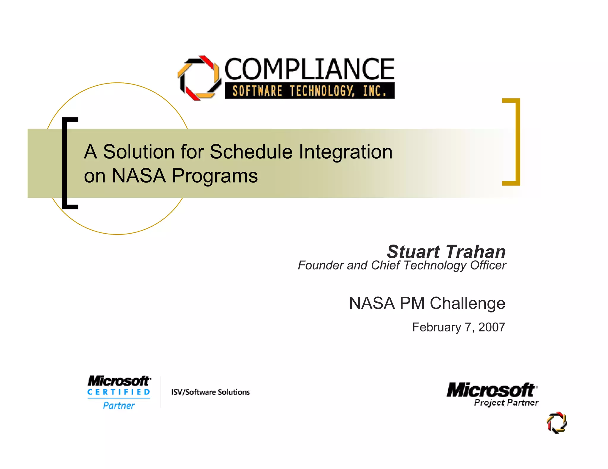 This document discusses solutions for integrating schedules on NASA programs. It introduces Stuart Trahan's company, which provides Earned Value Management (EVM) solutions using Microsoft Office Project that comply with OMB and ANSI requirements. It also introduces a partner company, Pinnacle Management Systems, that specializes in enterprise project management solutions including EVM, project portfolio management, and enterprise project resource management, with experience in the aerospace, defense, and other industries. The document defines schedule integration and describes some methods including importing to a centralized Primavera database for review or using Primavera ProjectLink for updates, and challenges including inconsistent data formats and levels of detail across sub-schedules.