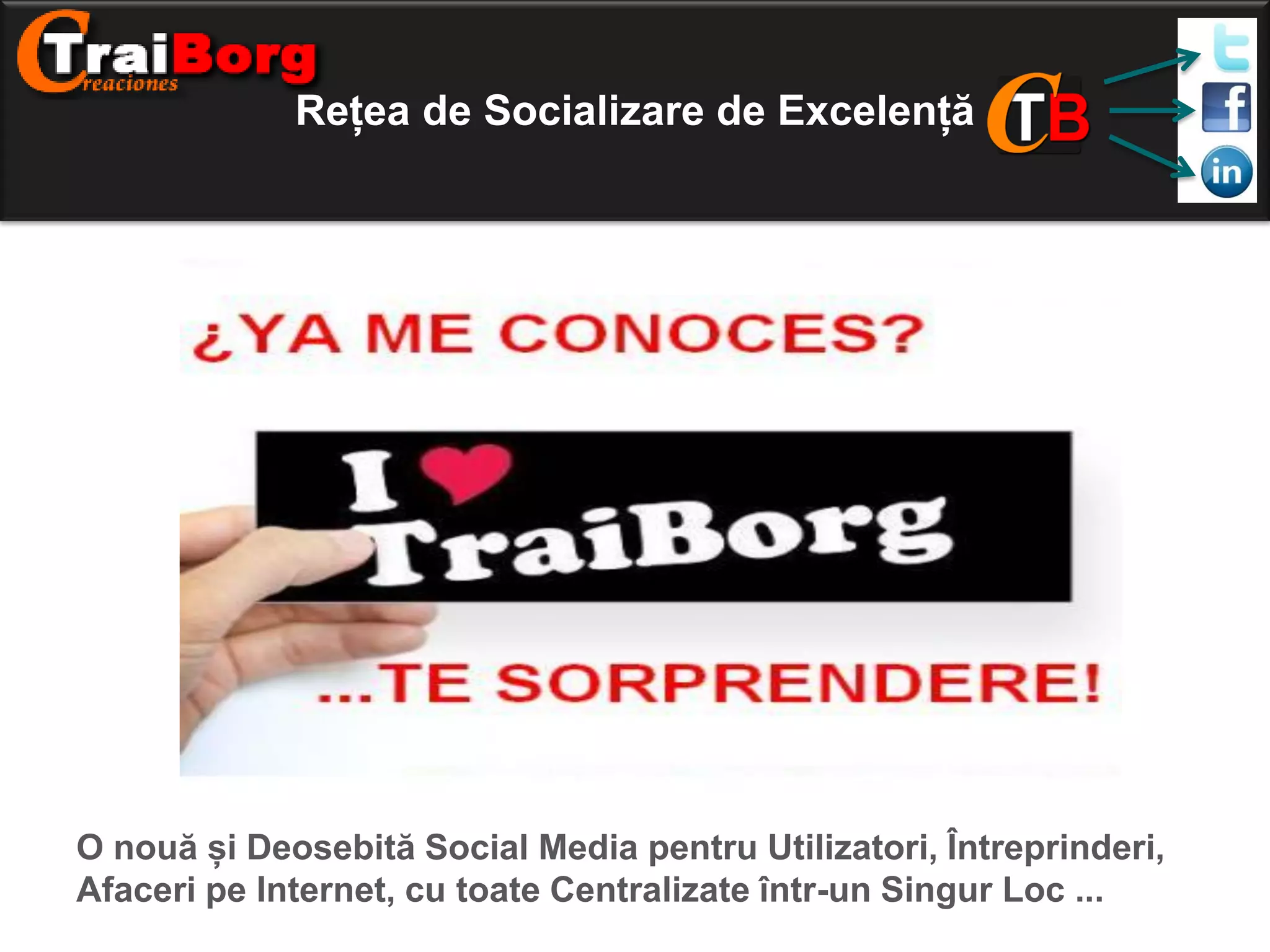 Traiborg este o rețea socială interconectată care oferă utilizatorilor funcționalități diverse, inclusiv videochat, anunțuri clasificate și oportunități de afaceri, concentrându-se pe un sistem de marketing prin afiliere. Membrii pot deveni afiliați gratuit și câștiga comisioane prin diverse activități, în timp ce opțiunile VIP oferă avantaje suplimentare pentru un cost anual. Sistemul utilizează o matrice 3x2 pentru a distribui veniturile, promițând oportunități de câștig considerabile pentru utilizatori.