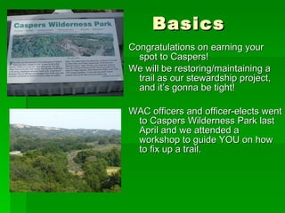 The document provides instructions for a trail maintenance project involving students. It introduces the tools that will be used, such as shovels, axes, and hedge clippers. Safety rules are outlined, such as holding tools safely and maintaining distance from others. The purpose of trail maintenance is explained, such as installing water bars to divert water, making the trail smoother and safer, and trimming bushes and cacti. Students are advised to ask officers or advisers if they need more information.