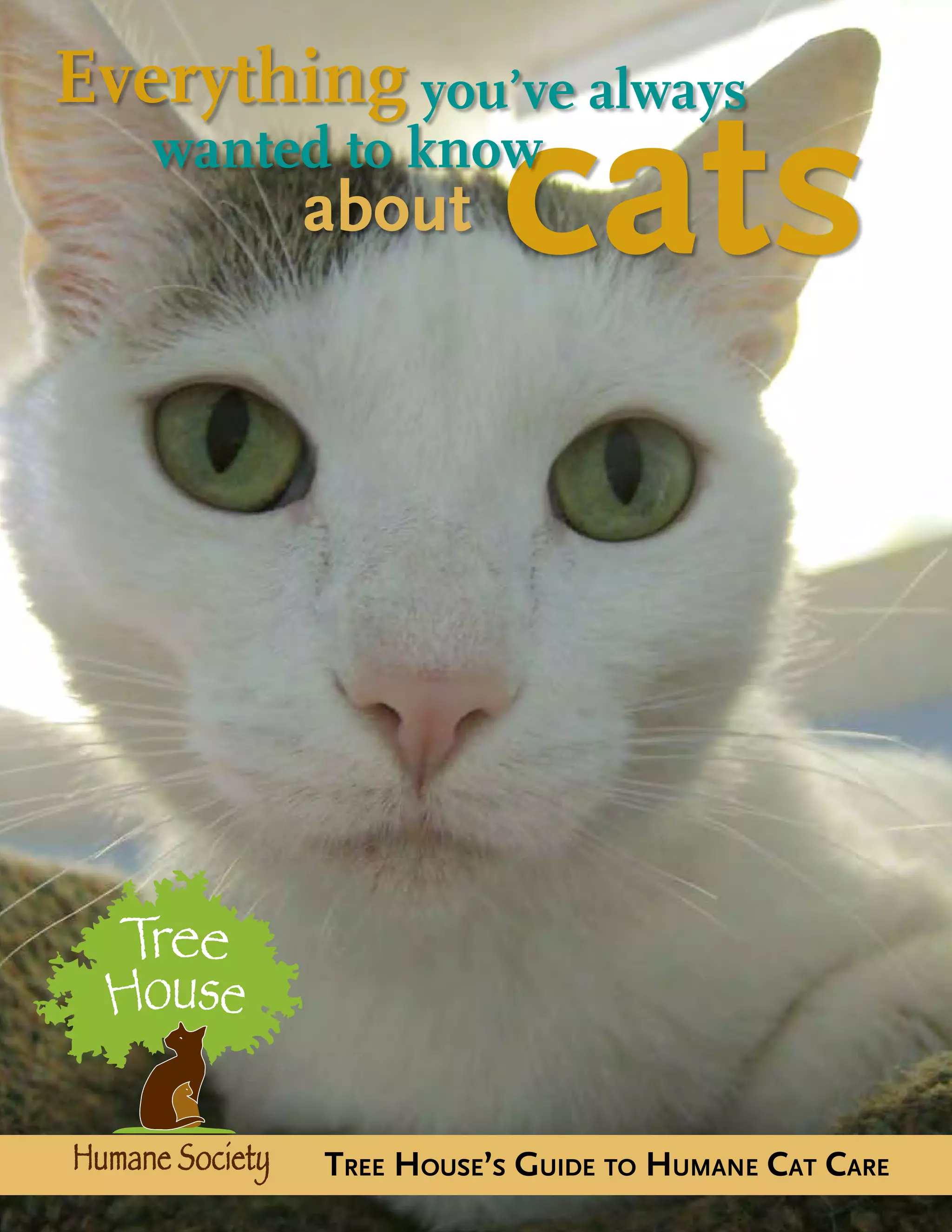This document provides a guide to humane cat care, covering topics such as adopting the right cat, understanding feline behavior and instincts, diet and nutrition, training, health issues, and caring for stray cats. It begins with a brief history of cats' domestication in ancient Egypt and discusses how modern housecats are genetically distinct from their wild ancestors, while still being influenced by ancestral instincts. The guide emphasizes that adopting cats from shelters provides homes for animals in need and helps reduce overpopulation. It provides tips for choosing a cat that fits an adopter's lifestyle and preparing one's home, as well as gradually introducing a new cat to existing pets.
