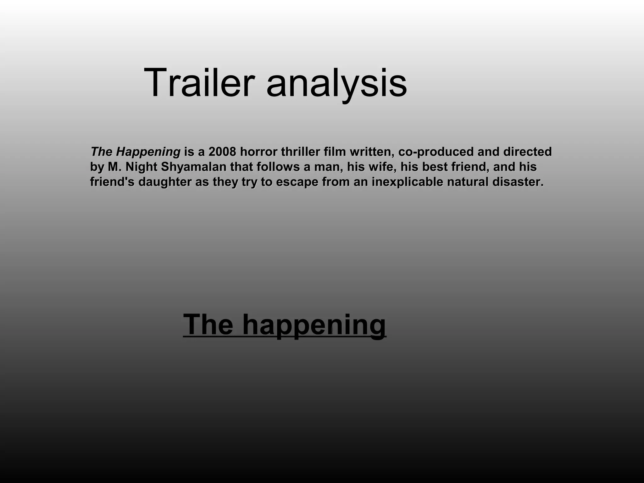 The trailer for the 2008 horror film The Happening effectively promotes the film and targets its intended audience. It establishes the genre as thriller/horror through suspenseful shots without revealing the unexplained disaster. A variety of characters meant to appeal to ages 18-30 are shown reacting to the event without understanding its scope or cause. M. Night Shyamalan's previous successes in similar genres build confidence in the film. Close-ups of characters' scared reactions heighten the drama without explaining the threat. The trailer promises revelation of unknown forces at work to compel viewers to watch the film.