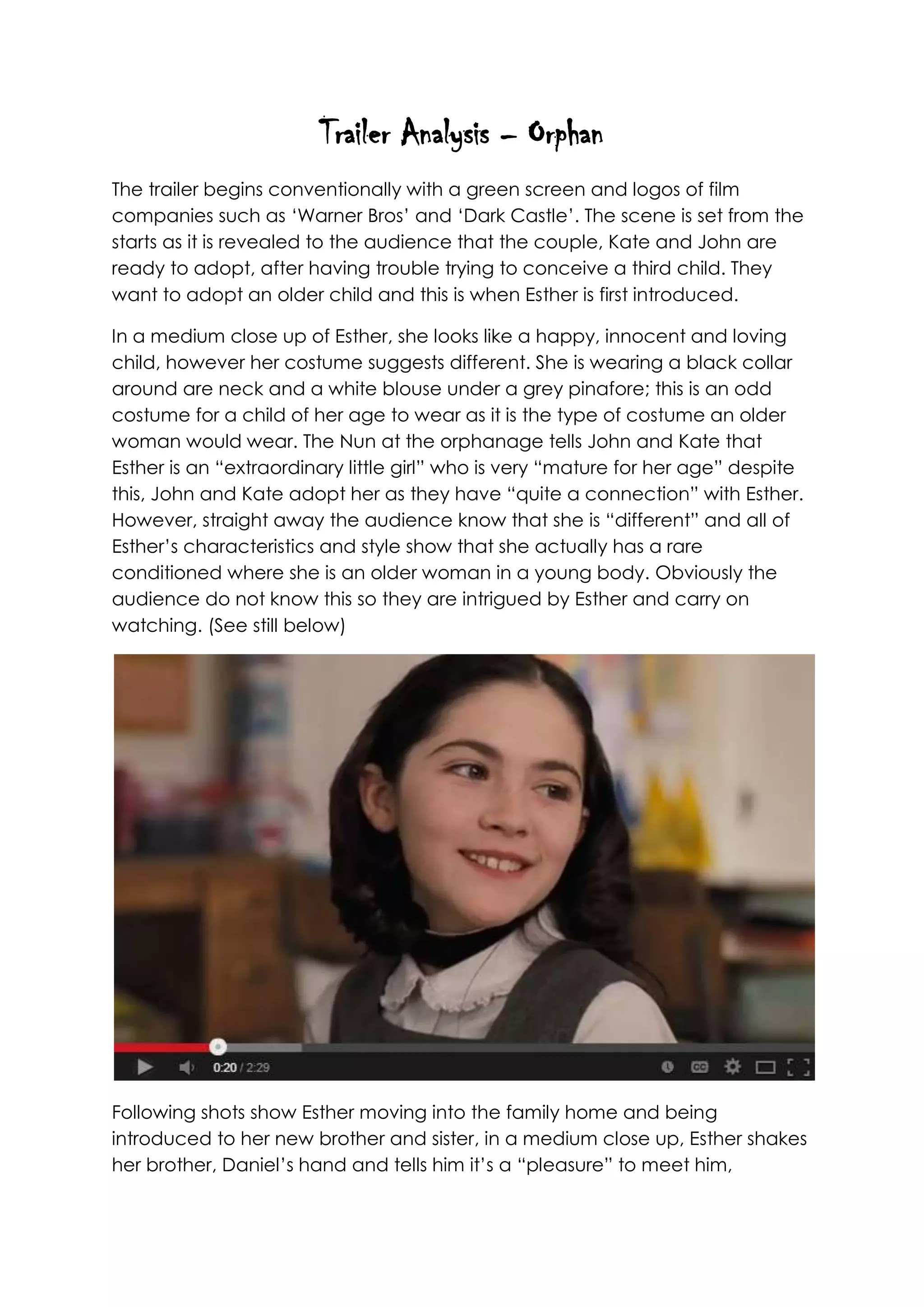 The trailer introduces Esther, an orphan girl adopted by Kate and John who seems innocent but odd. Her behavior becomes increasingly disturbing and dangerous, as she torments the family's other children, causes accidents, and seems to be taking over the family. It's revealed that Esther has a secret, and the trailer builds tension to reveal what her secret is and how far she will go to destroy the family. Shots of violence, screaming, and threats escalate to leave viewers desperate to learn Esther's secret and see if the family can survive her in the film.