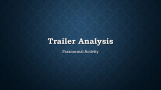 Micah and Katie, a young couple, experience increasingly disturbing paranormal activity in their suburban home that is captured on video over three weeks. Point-of-view camera shots are used to make the audience feel like they are experiencing the events along with the characters. The trailer starts calmly but builds tension through unsettling sounds and cuts between scenes to scare the audience and make them want to find out more.
