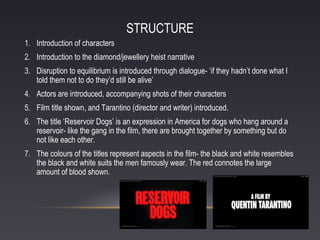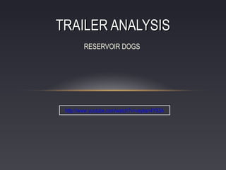 The trailer for Reservoir Dogs introduces the characters and heist plot through dialogue and shots of the actors in their signature black and white suits. It establishes that the heist goes wrong by disrupting the group's equilibrium. The editing cuts between scenes and action quickly to imitate the film, while the song "Stuck in the Middle with You" and gunshot sounds set the tone. Camera work like tracking and reaction shots show tension between the characters and foreshadow conflict during their "perfect crime."