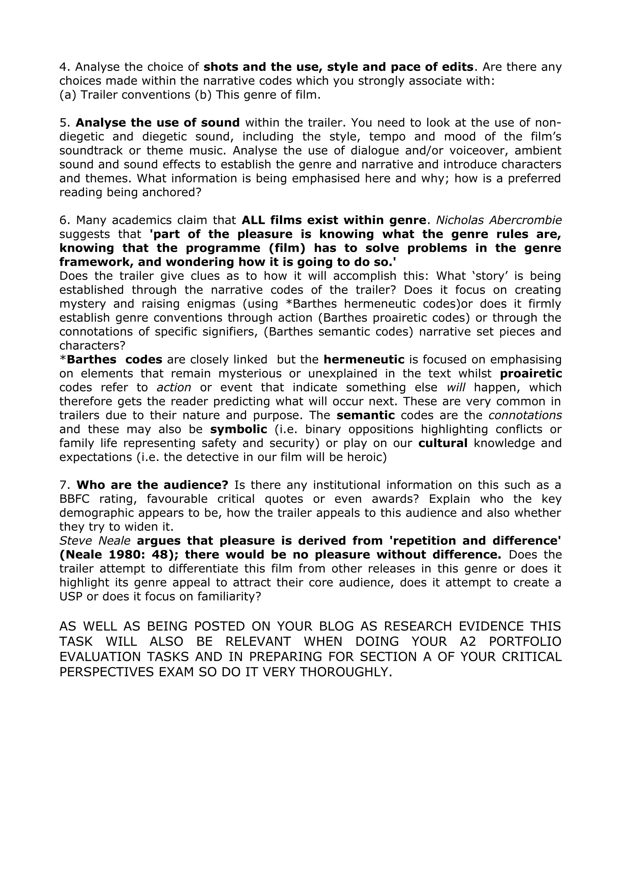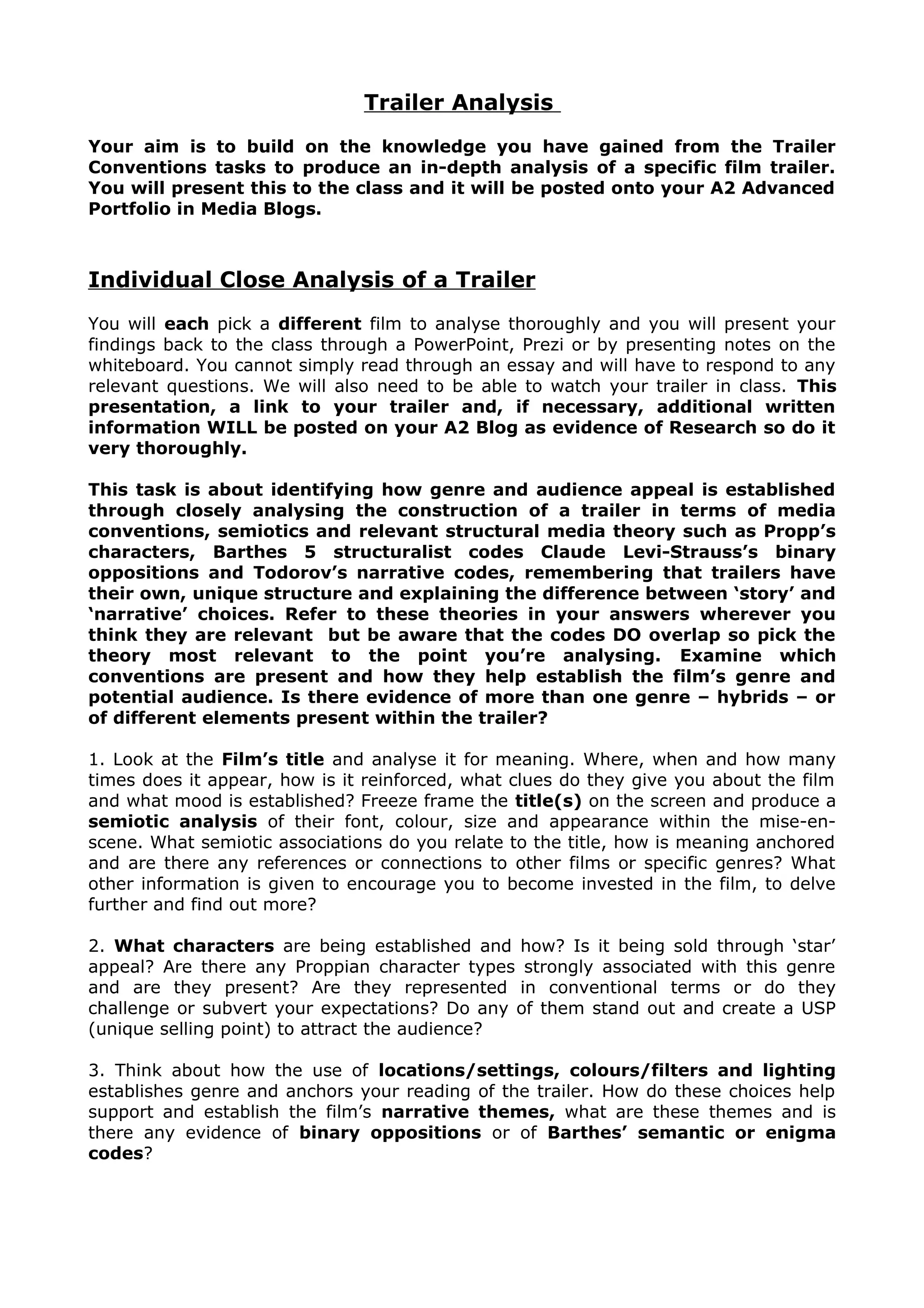 This document provides instructions for students to analyze a film trailer in depth and present their findings to the class. Students will select a different film to analyze, examining elements like the title, characters, settings, editing, sound, and how the trailer establishes genre and audience. The analysis should apply concepts like Barthes' structuralist codes and reference theories by Propp, Levi-Strauss, Todorov, and Abercrombie. The thorough analysis will be posted online as part of the student's portfolio and help prepare for exam tasks.