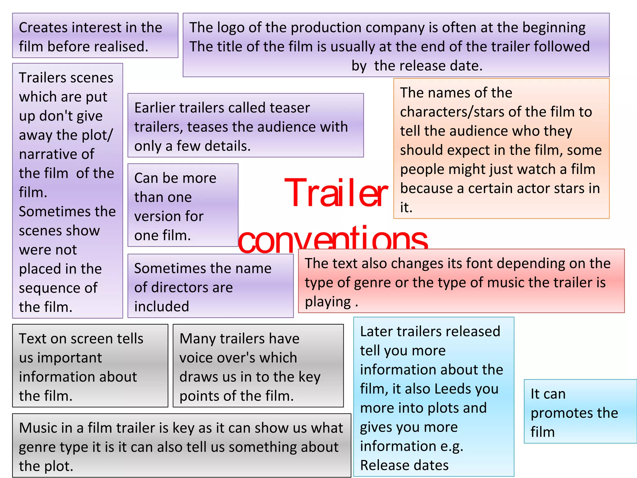 Trailers are designed to create interest in a film without revealing too much of the plot. They often begin with the production company logo and end with the film title and release date. Scenes shown may not be in the actual sequence or may omit key details. Text on screen and the names of stars are used to indicate what type of film it is and who is in it. Music and voiceovers aim to draw the audience in without fully explaining the narrative. Later trailers provide more information about characters and the plot to further promote and advertise the film.