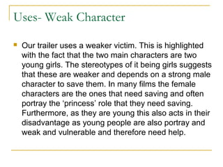 The document discusses techniques used in a trailer to build tension and highlight weaknesses of the main characters. It focuses on using young female characters who are portrayed as weaker and needing saving. Dynamic music is used, including heavy breathing and increased heartbeats to suggest panic and tension. Video clips are sped up and reversed, adding confusion and a sense that the characters' fate is already decided. The dense woodland setting is stereotypically associated with danger. A voiceover was avoided to not distract from the visuals and dynamic sound effects.