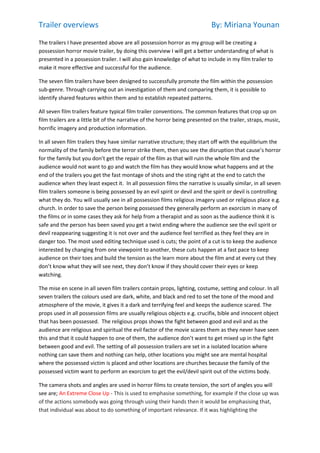 The document analyzes 7 film trailers for possession horror movies to understand how to effectively promote such a film. All 7 trailers follow common conventions: showing the normal family life disrupted by terror, without revealing the full narrative resolution. They feature quick cuts between shots to build tension. Settings are isolated to suggest helplessness, and use of dark colors, religious props, and manipulated speech/sounds increase fear. Non-diegetic text leaves questions unanswered, enticing viewers. Analyzing these trailers provides knowledge of effective techniques to include ominous music, disturbing imagery, and a shocking climax in the author's own possession horror film trailer.