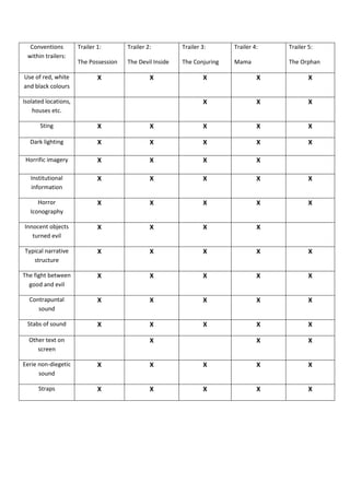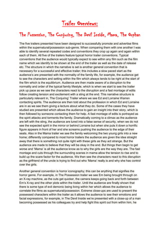 The document analyzes conventions used across the trailers for five horror films in the supernatural/possession genre: The Possession, The Conjuring, The Devil Inside, Mama, and The Orphan. It finds that all five trailers employ typical horror conventions like ominous music, dark lighting, horrific imagery, and a narrative structure involving an disruption to normality. Specifically, the trailers make heavy use of close-ups, changes in eye/iris color to signify possession, unnerving sounds, and text straps to build intrigue and scare audiences. Overall, the document concludes the trailers successfully promote their films and appeal to fans of the supernatural/possession subgenre through shared conventions.