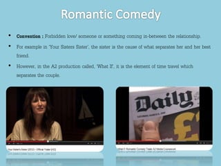 This document discusses conventions and inspirations across several film genres, including romantic comedies, sci-fi/thrillers, dramas, and horrors. For romantic comedies, a common convention is something or someone coming between the relationship, while fonts are often influential due to their relevance to the storyline. Sci-fi/thrillers frequently explore unpredictable events becoming real, such as aliens, and manipulate everyday elements. Dramas aim to highlight something positive from realistic situations and often feature realistic characterizations. Horrors traditionally involve something inhuman causing fear, though this is changing to include true historical events.