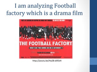 The trailer for the film The Football Factory is over 1 minute and 30 seconds long, showing it is not a teaser trailer. It reveals the protagonist is involved in a football gang and the film follows his story. Fast cuts and a narration at the beginning set the serious and aggressive tone. The target audience is young male adults in the UK who can relate to the English football teams and crime depicted, which has been a problem associated with football there.
