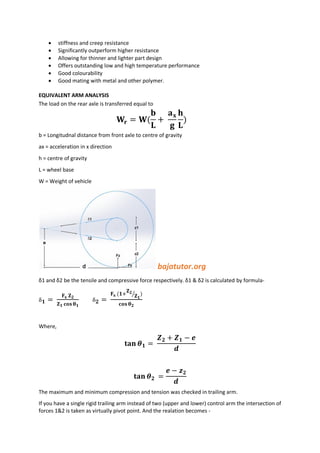 Trailing arm suspension uses an arm parallel to the vehicle's longitudinal axis to connect the wheel to the frame. A semi-trailing arm makes an angle with this axis. Trailing arms provide a rigid connection to the wheel with no camber change. A semi-trailing arm allows adjustment of roll center height and camber curve. Different bushing materials can be used, like Delrin nylon or POM, which provide durability and smooth movement while withstanding wear.
