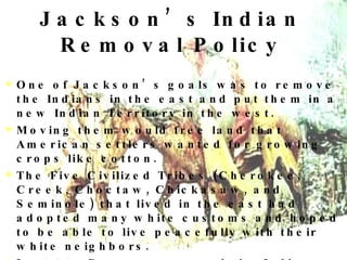 Jackson's Indian Removal Policy aimed to move Native American tribes from lands in the eastern U.S. that settlers wanted for farming to an Indian Territory in the west. While some tribes willingly relocated, others resisted removal, which often led to violence against them. In 1830 the Indian Removal Act allowed the federal government to force the relocation of tribes such as the Cherokee, thousands of whom died during the subsequent Trail of Tears march to Oklahoma.