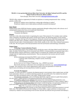 The document summarizes the TEAMS Outreach Program, which partners students from multiple schools with entrepreneurial projects. The program focuses on commercializing technologies and supporting economic development. Student teams work directly with clients on projects like feasibility studies, strategic plans, and community assessments. Projects come from sources like Idaho National Lab and support economic growth. Students gain experience applying business skills to solve real problems. The program has supported over 40 technology projects and many other initiatives. It provides students hands-on learning while creating value for clients and communities.