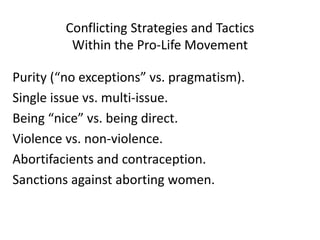 The document discusses various internal and external sources of stress and strain faced by pro-life activists. It identifies conflicting strategies within the movement regarding exceptions and issues. Sources of stress include opponents, doubts, and unrealistic standards. Symptoms range from temporary illness to burnout. The document recommends managing stress through prayer, community, breaks from activism, and focusing on one's spiritual life.